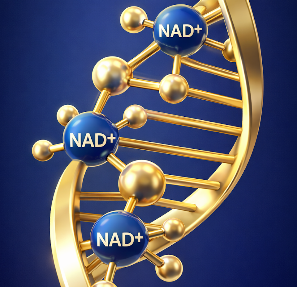 NAD+ (nicotinamide adenine dinucleotide) is a crucial molecule found in every living cell that supports energy production, mitochondrial health, and DNA repair – processes essential for maintaining youthful, resilient cells.